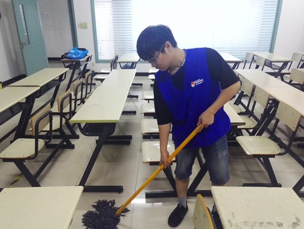 义工们在海天楼五楼进行了集合,他们手中拿着打扫工具,有组织、有纪律的在指定地点等待着,而后都很快的行动起来,纷纷积极的往各个教室走去,把教室里的纸屑灰尘等都认真的打扫干净,并把玻璃擦得闪闪发光。同学们都尽自己最大的努力做自己力所能及的事情。在同学们一个多小时的努力下,原本脏乱的教室变得整洁,给同学们带来了一个更加舒适的学习环境。