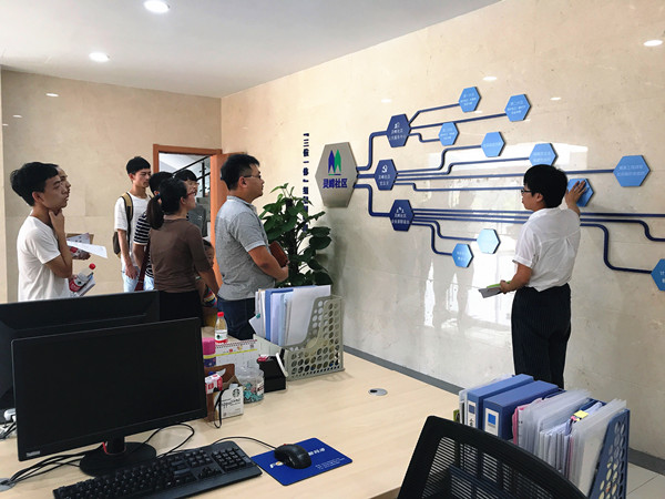 师生党员一行随后参观了社区“工匠学堂”、工会活动室,走廊文化,流动图书馆,“智HUI墨客”众创空间等亮点工程,领略了社区深刻的文化内涵。随后为正在社区开展暑期“三下乡”“兼职社工”社会实践的学生带去了关怀,送去了慰问,也告诉学生们要在社区踏踏实实工作,服务社区,服务他人。