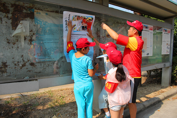 活动开始,首先由大学生志愿者陈俊磊为小朋友们上了一堂“五水共治”主题课程,课程中,陈俊磊利用PPT动画的形式,穿插环境保护案例,以通俗易懂的语言讲解了“五水共治”的背景和意义,全面解读南湖区在“五水共治”方面的政策和行动计划,并回答了小朋友们的提问,告知小朋友们在活动过程中的注意事项。在活动过程中,小朋友们排着整齐的队伍向着居民企业出发,并将“五水共治”有关手册、扇子、海报发给居民和企业,还对居民企业进行“五水共治”知识的普及和讲解。最后我校暑期兼职社工带领小朋友们一起在村中公告栏展出了五水共治主题海报。