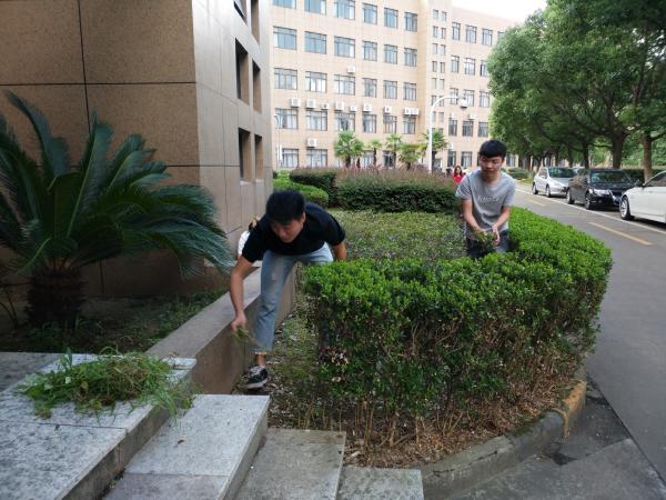 (工商管理学院学生志愿者正在进行杂草清理工作)