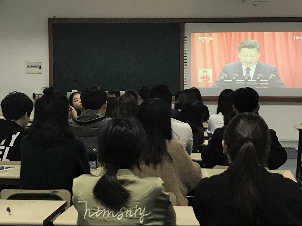 盛世逢盛会,喜迎十九大。2017年10月18日晚上六点二十分,商贸外语学院于明德楼308教室组织团委学生会干事集体观看党的十九大开幕盛况,一起学习习近平主席系列讲话。习近平总书记在讲话中对过去五年的工作和历史性变革做了回顾,让大家品味着砥砺奋进的丰收喜悦、激发智慧与担当、张扬梦想与情怀的场景,耳边回响着习近平总书记对发展的殷殷重托。五年耕耘,硕果累累;砥砺奋进,成就辉煌。