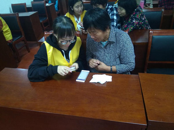 一走进社区时,阿姨们正在进行个人卫生的课程,志愿者们便安静的走到后面的位置坐下,等待课程的结束。在课程结束之后,在百灵社区负责人的带领之下,由商贸外语学院的志愿者们上台为阿姨们讲解智能手机的使用方法,并有志愿者进行一对一的教导。在志愿者的细心教导之下,阿姨们不仅学会了如何用微信聊天,打语音电话,刷朋友圈等等,还学会用手机拍照。在阿姨们学会之后,还现场为志愿者们拍照,记录志愿者们热心服务的样子。在短短的志愿者服务中,志愿者们很快与阿姨们成为了好朋友,互相添加了微信好友,并约定下一次的见面。