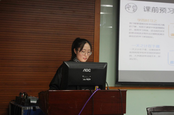 本次的大赛延续了昨日紧张而又激烈的气氛,来自商日、应韩、应西和应德班级的同学都较好地展示了个人或学习小组的优秀的学习方法,以及她们通过自己探索的学习方法所带来的傲人的成绩。来自应德3150的柯慧敏同学作为第一个出场选手,为我们详细地介绍了学习德语的方法。她将学习德语的方法分成三个部分——课文、单词和学习app。首先在学习课文时,要懂得提前预习,写下疑问;其次记单词时要根据单词的词性进行有效记忆;最后再使用学习app进行辅助和加强。何慧敏同学还指出学习语言要形成自身独特的风格,根据自身情况对症下药,查漏补缺。最后特别重要一点就是善于向专业老师请教和探讨,解决自己的疑问。之后几组的同学演讲得也相当精彩,各具特色,同学们面对评委老师的问题建议也都能够应答自如和虚心接受。希望我院同学们能够从她们的学习方法中启发受益,努力向她们看齐。
