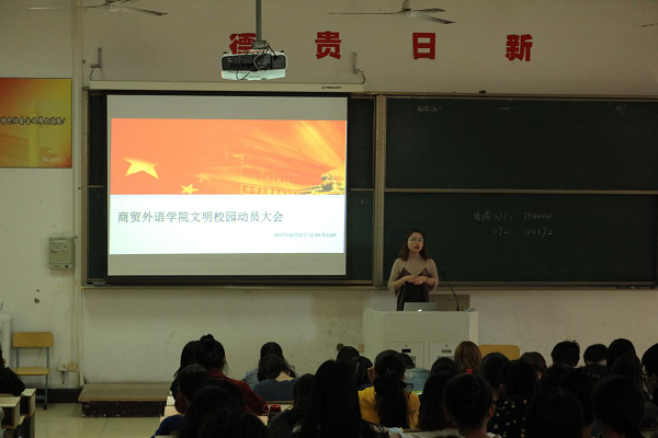 为了提高校园文明程度、师生文明素质以及校园文化生活质量,大力加强校园文明建设和管理,着重培育社会主义道德风尚。商贸外语学院于10月27日12:30许于1103教室召开了创建文明校园动员大会。出席本次大会的有商贸外语学院团委王茹佳老师,各班团支书,团学干事、预备党员及入党积极分子。